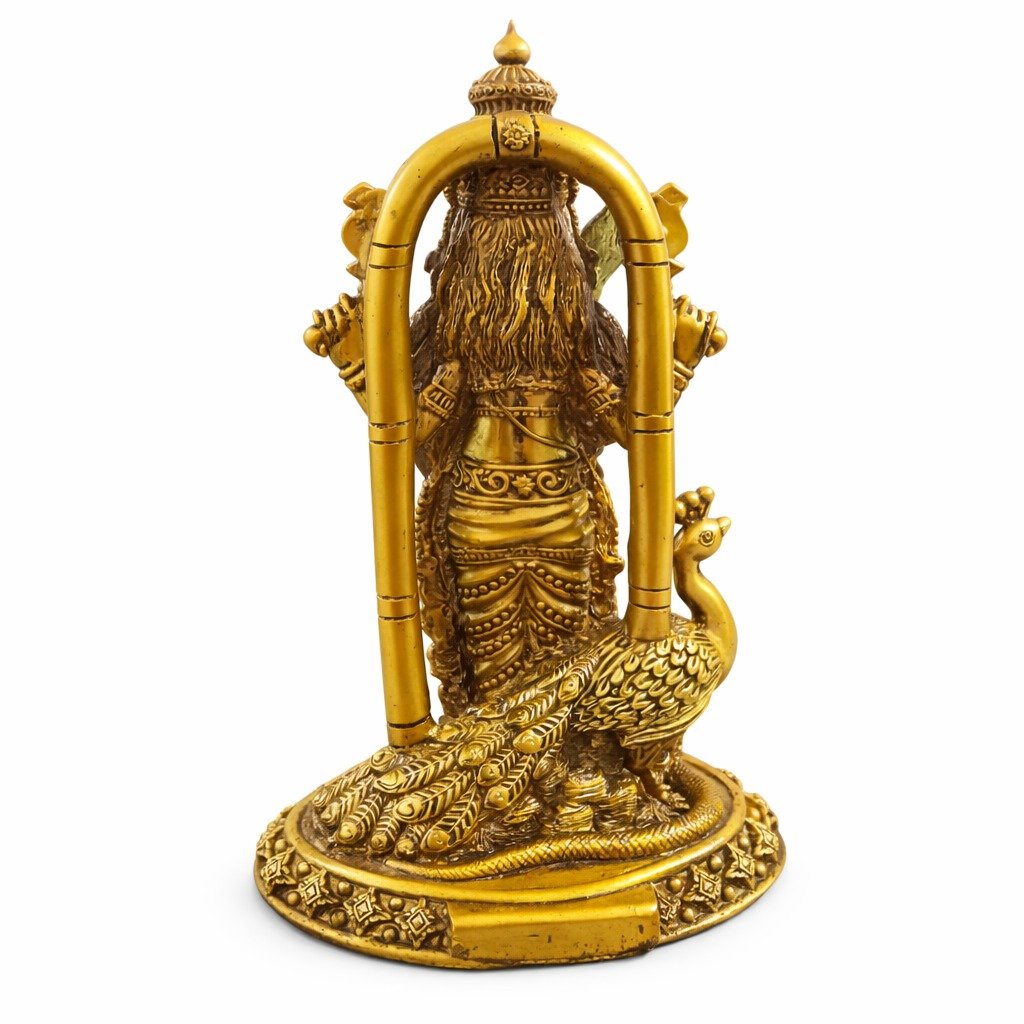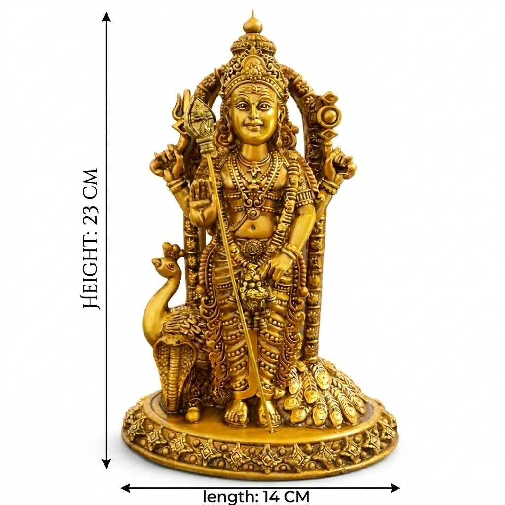 Invite divine blessings, strength, and positivity into your home with this exquisitely crafted Lord Murugan Idol with Peacock. Also known as Kartikeya, the God of war and victory, Lord Murugan symbolizes courage, wisdom, and protection—making this statue a powerful addition to your pooja room or living space.Beautifully designed with intricate detailing, the idol features Lord Murugan holding the sacred Vel (spear), accompanied by his divine vehicle, the peacock. The rich golden finish enhances its spiritual aura while adding a touch of elegance and luxury to your décor. Crafted from high-quality material, this statue is durable, long-lasting, and perfect for daily पूजा rituals, meditation spaces, or as a decorative showpiece. Its detailed craftsmanship reflects traditional artistry, making it ideal for those who appreciate both spirituality and fine design.